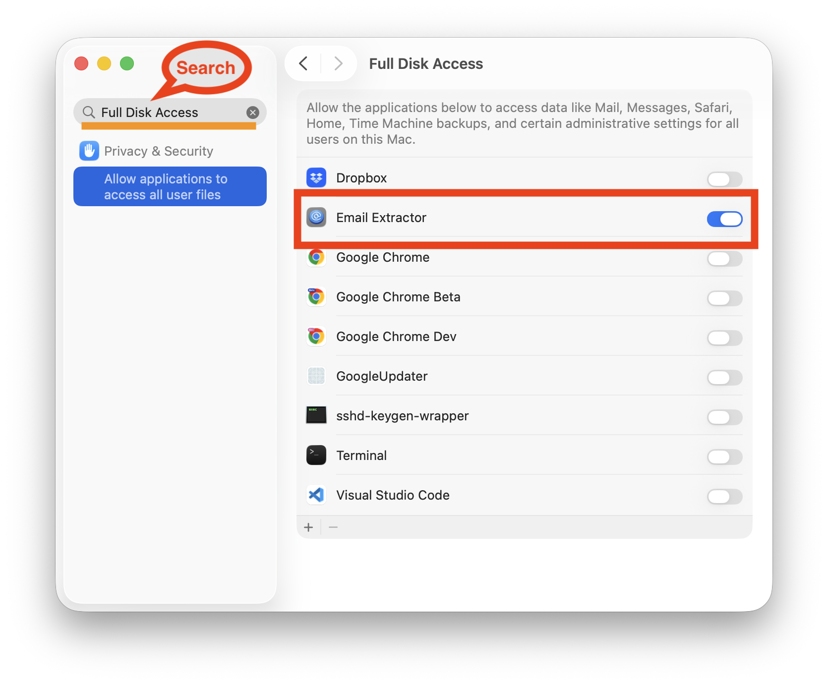Email Extractor with full disk access (Make sure the check mark ✅ is checked)